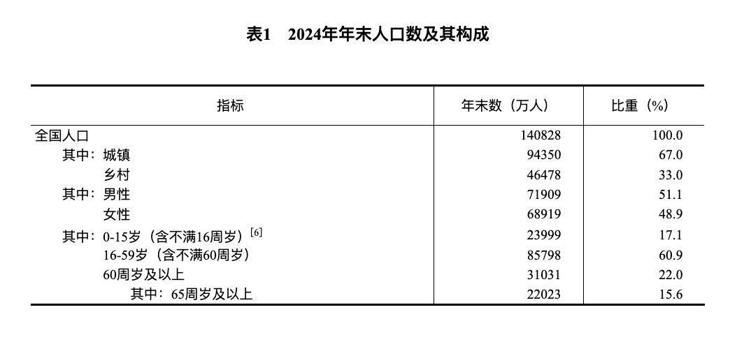 《公报》显示,2024年年末全国人口140828万人,比上年末减少139万人,其中城镇常住人口94350万人。全年出生人口954万人,出生率为6.77‰;死亡人口1093万人,死亡率为7.76‰;自然增长率为-0.99‰。