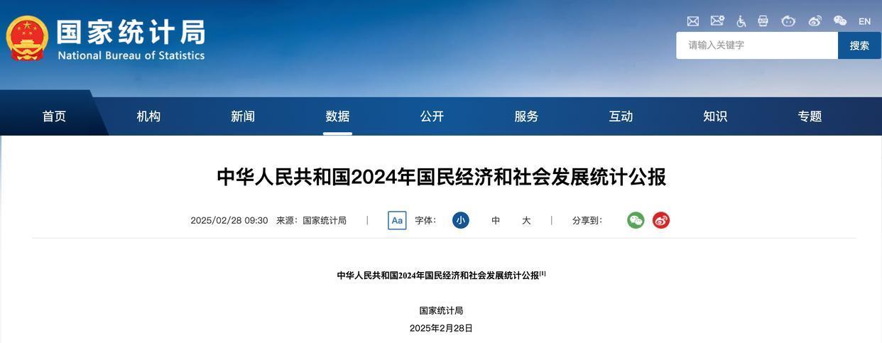 2月28日,国家统计局发布《中华人民共和国2024年国民经济和社会发展统计公报》。