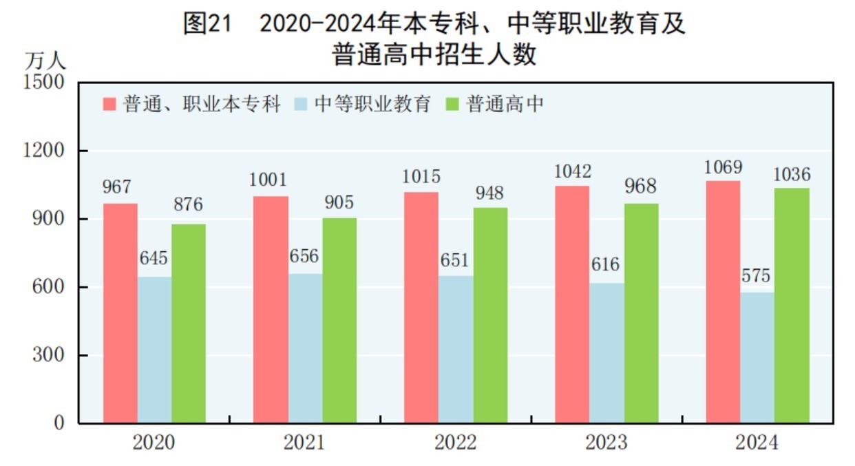 普通、职业本专科招生1068.9万人,在校生3891.3万人,毕业生1059.4万人。